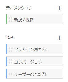 上の画像の「新規/既存」、「ユーザーの合計数」、「セッションあたりのエンゲージメント時間」、「コンバージョン」のところに、それぞれ1回ずつ、「ダブルクリック」してください。