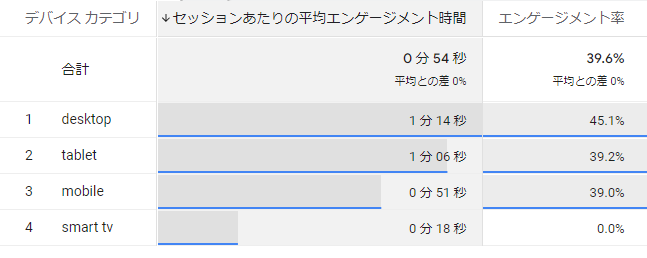 あとは、この画像の「デバイス カテゴリ」、「セッションあたりのエンゲージメント時間」、「エンゲージメント率」のところに、それぞれ1回ずつ、「ダブルクリック」してください。