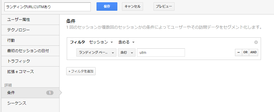 「(direct) / (none)」を選択した後、この画面で「ランディングページにUTMが含まれる」セグメントを行いますが、まだセグメントがない方は下記のように設定できます。