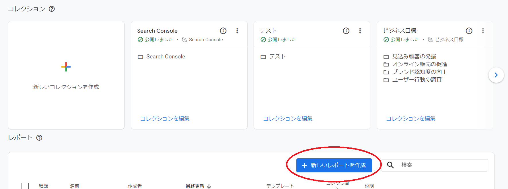 この画面から「新しいレポートを作成」からレポートを作成できます。