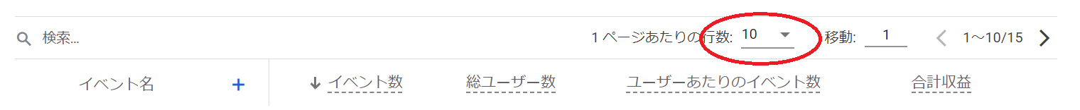 ここを開くと、イベントのテーブルがありますが、イベントが10項目以上ある場合は、テーブルの右上に、「1ページあたりの行数」で最大1ページ250項目表示できます。