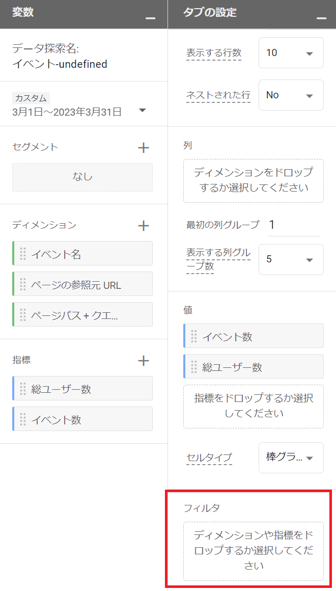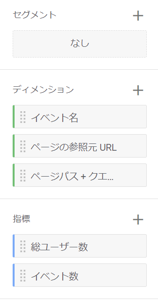 今回の探索レポートの目的は、「『undefined』イベントはどこからきているかを調べる」ということで、ディメンションと指標をこのように設定します。