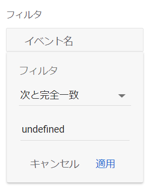 フィルタは「イベント名」を選択して、条件は「完全一致」、内容な「undefined」を入力して、「適用」をクリックします。
