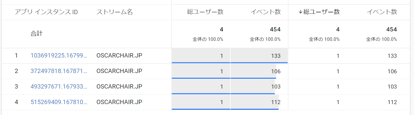 ここでユーザーごとにどれぐらいイベント発生させたのかがわかってきます。