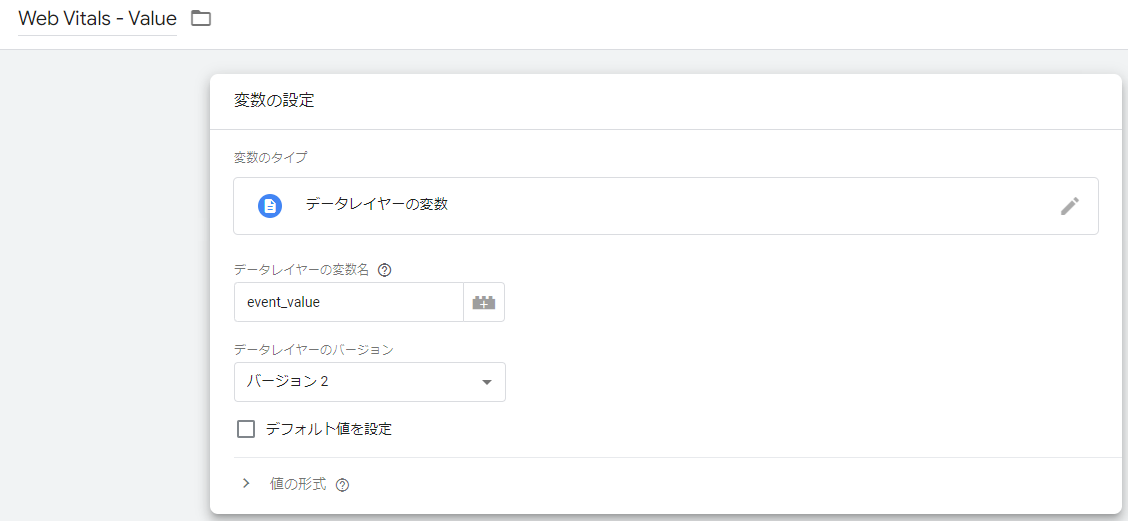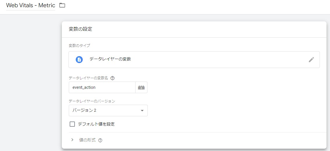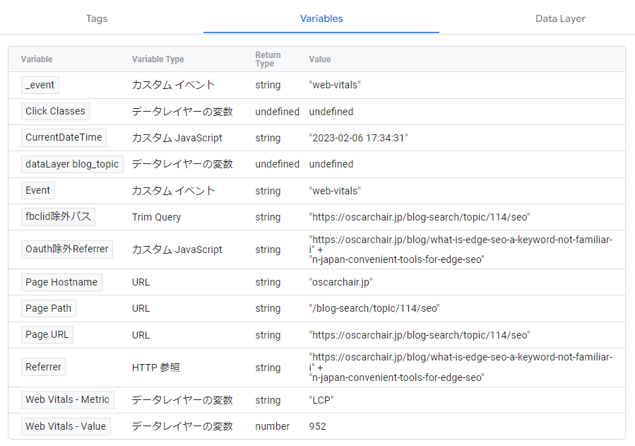 それぞれのweb-vitalsをクリックして、「Variables」のタブを確認すると、下記のように「Web Vitals - Metric」と「Web Vitals - Value」を確認することができます。