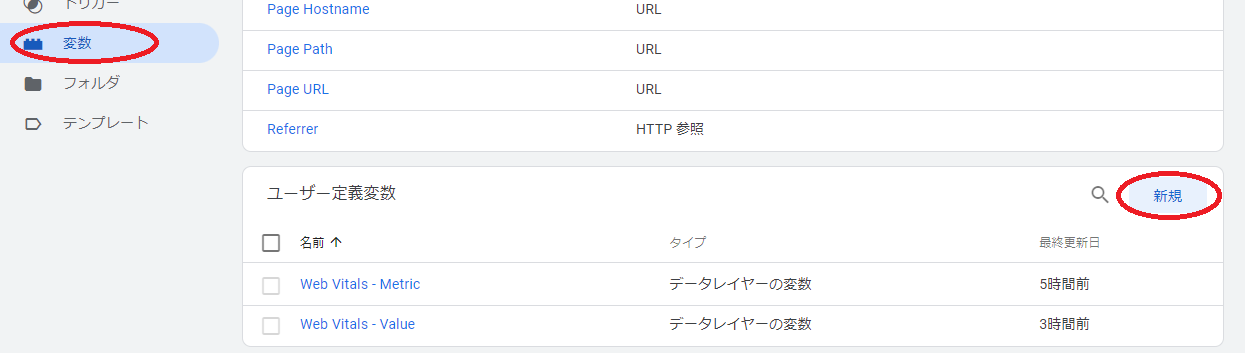 「変数」メニューに入り、ユーザー定義変数の「新規」をクリックします。