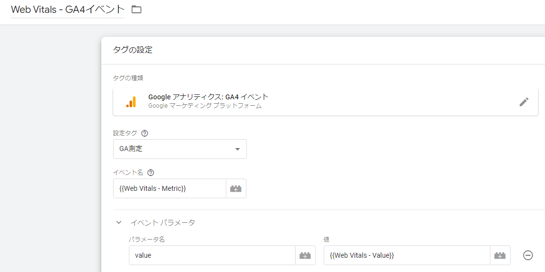 JSに書いてあった「web-vitals」イベントはGTMを発火させるものであって、GA4に連携するイベントはそれぞれのパラメータのはずです。