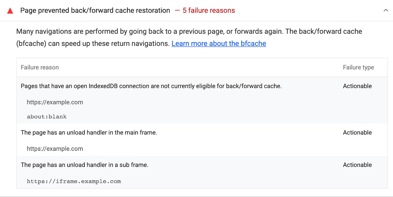 ブラウザにはbfcacheからページを復元させない方法はいくつかありますが、今回の新しいLighthouse診断では、実際にテストページから移動したあと、ページに戻ることで、bfcache可能かどうかをテストを行います。さらに、失敗した場合はその理由を説明するようになっています。