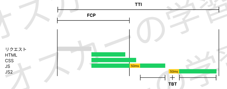TBTの定義は、FCPとTTIの間、50ms以上かかたタスクで、そのオーバーした部分の合計の数値になります。