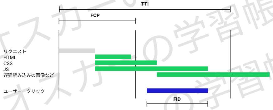 下記の例で言いますと、仮にユーザーのクリックを反応するため、JSの読み込み完了が必要となりますと、FIDはクリックしてからJSの読み込み完了までの時間になります。