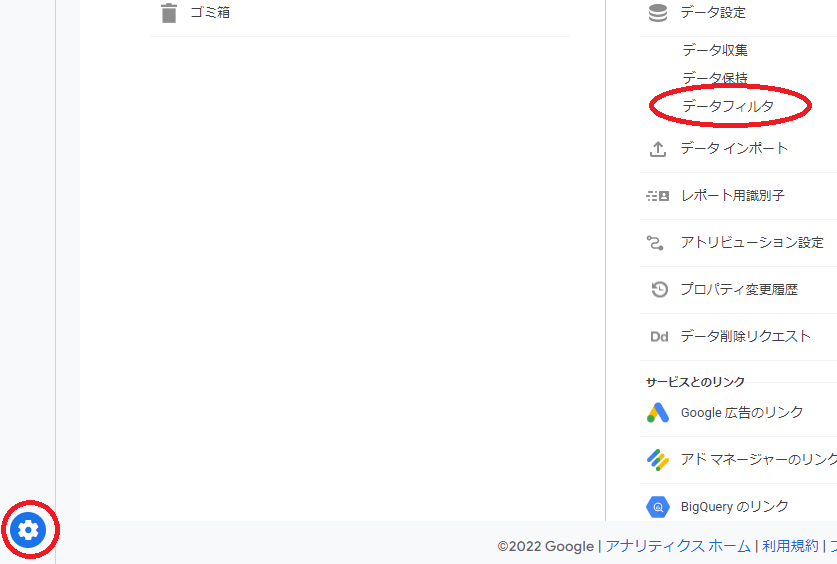 ①「設定」→プロパティの「データフィルタ」へ移動